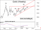 Am 09.04.2007 konnten die Kurse des Goldes das Vormonatshoch bei 681,80 erstmalig überschreiten. Diese Tatsache ist durchaus positiv zu beurteilen. Doch schafften es die Kurse des gelben Edelmetalls dann nicht die wichtigen Widerstände zwischen 699 und 702 zu überwinden. Insgesamt weist der Monat April die niedrigste Schwankungsbreite der letzten elf Monate auf, die Bewegungsdynamik ist demnach als rückläufig zu beurteilen. Der Schlusskurs des Aprils befindet sich über dem Eröffnungsniveau und dem Märzhoch, was in der Einzelbetrachtung als leicht positiv zu werten ist.Aus der Perspektive des langfristigen Monatscharts bleibt die Chartsituation neutral bis verhalten bullish. Seit elf Monaten handeln die Preise des Goldes in dem eingezeichneten Konsolidierungsbereich zwischen 702 und 560, bezogen auf den aktuellen Juni-Kontrakt. Erst Kurse außerhalb diesen Bereiches sind maßgeblich für die Entstehung eines neuen langfristigen Trends. Die Konsolidierung an den Hochs des großen Stauraum, sowie der eingezeichnete Aufwärtstrendkanal seit Oktober 2006 lassen die Chancen für einen Ausbruch nach oben wachsen.